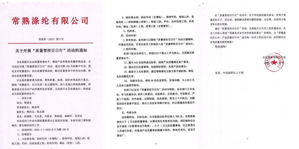 Od pokretanja "Kampanje za kontrolu kvalitete stota" 1. ožujka 2025. godine, Changshu Polyester je usidrio svoje sveobuhvatne ciljeve upravljanja kvalitetom temom "Poboljšanje kvalitete, stotnoj kampanji" i pooštrio kvalitetan "sigurnosni ventil" kroz više dimenzija i mjera. Podaci pokazuju da se broj pritužbi dviju poslovnih jedinica tijekom događaja značajno smanjio u odnosu na prošlu godinu, a došlo je do značajnog poboljšanja svjesnosti kvalitete i optimizacije procesa.